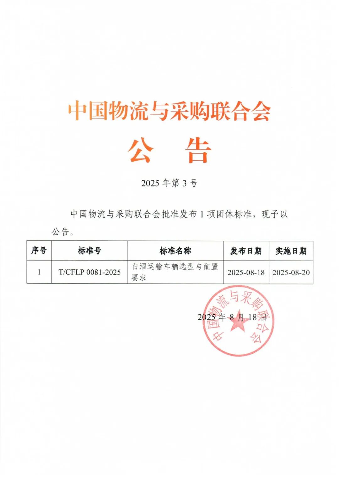 中物联2025年第3号公告《白酒运输车辆选型与配置要求》团体标准发布
