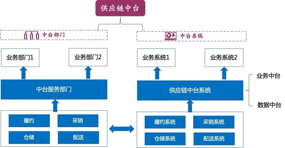 我们通常说的中台局限在系统层面,但实际上,系统是源自于业务的,在很多公司,中台不仅包含中台化系统,还包含中台业务部门,还是拿供应链来说明: