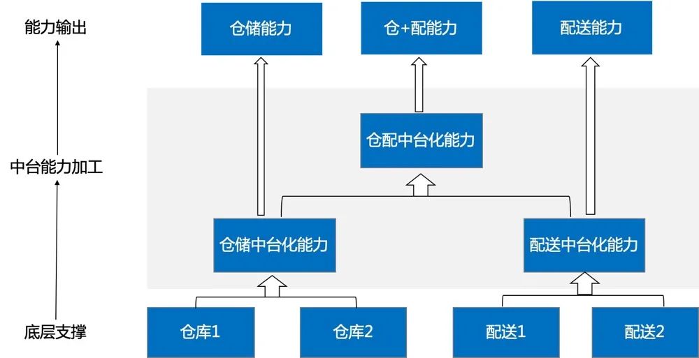 举个例子:X公司底层有多套仓储系统和多套配送系统,通过中台化能力加工以后,将所有的仓储系统抽象为标准的仓储能力输出,将配送系统抽象为标准的配送能力输出,同时将仓储和配送能力合并后输出仓+配能力,这便为业务输出了3种供应链中台能力:仓储能力、配送能力和仓+配能力,如图所示,至于底层有多少套具体的仓储系统和配送系统,逻辑有多复杂,业务同学完全无感知。
