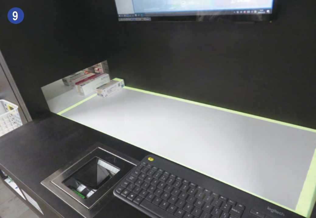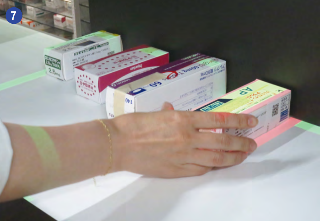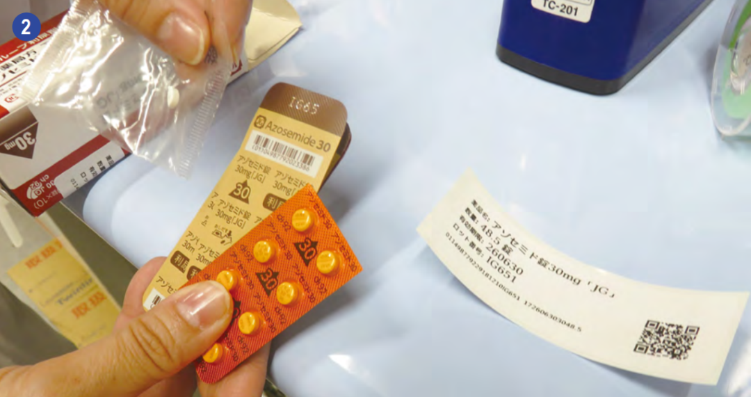 渡部正之的创意是将操作模式改为日本药房常用的PTP铝箔分装。关键在于改造后,开封的药盒可以保留剩余药品继续使用。具体而言,每次取药后都会根据剩余药量生成新的GS1编码标签。这个密封标签可以覆盖原有条码,实时更新药品信息,使机器人能精确管理每一片药的库存。标签自动打印,人工只需完成粘贴操作(见图❶~❹)。虽然每次粘贴看似麻烦,但实际操作远比人工清点、记录、归位等重复劳动轻松得多。